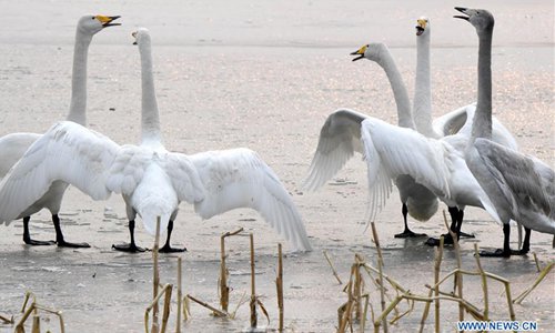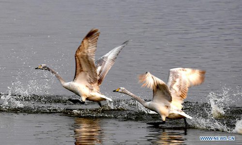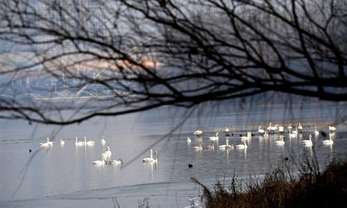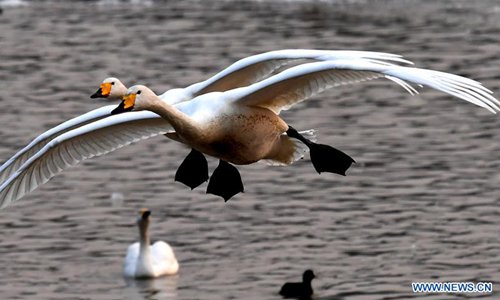 Photo taken on Jan. 3, 2019 shows white swans at the Yellow River wetland in Sanmenxia, central China's Henan Province. White swans have flown from Siberia to the Yellow River wetland to spend winter. (Xinhua/Zhu Xiang)