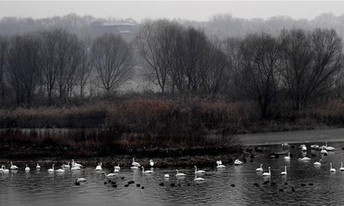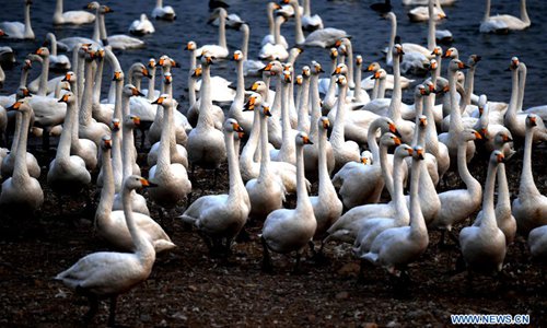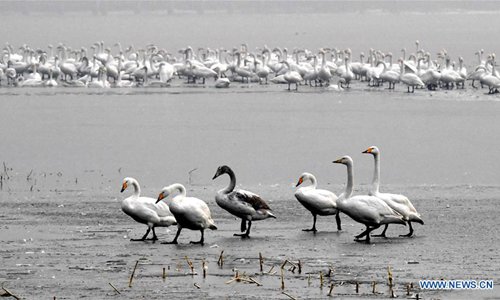 Photo taken on Jan. 4, 2019 shows white swans rest at the Yellow River wetland in Sanmenxia, central China's Henan Province. White swans have flown from Siberia to the Yellow River wetland to spend winter. (Xinhua/Wang Ding)