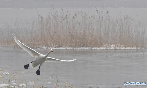 Photo taken on Jan. 4, 2019 shows a white swan at the Yellow River wetland in Sanmenxia, central China's Henan Province. White swans have flown from Siberia to the Yellow River wetland to spend winter. (Xinhua/Wang Ding)