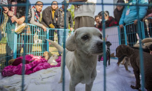 Stray dogs wait to be adopted at the Lord Bao Park in Hefei, East China's Anhui Province on Sunday. About 100 dog lovers visited the park and some of them successfully adopted a dog. The adoption is free but adopters are required to pledge that they will not abandon the canines. Photo: CFP