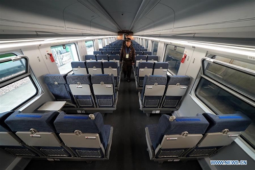 Photo taken on Jan. 6, 2019 shows the sitting carriage of a CR200J train at the China Railway Shanghai Group Co., ltd. in Shanghai, east China. The CR200J train, with a centralized power system that runs 160-km-per-hour, will be put into use before the Spring Festival travel rush in 2019.(Xinhua/Chen Fei)