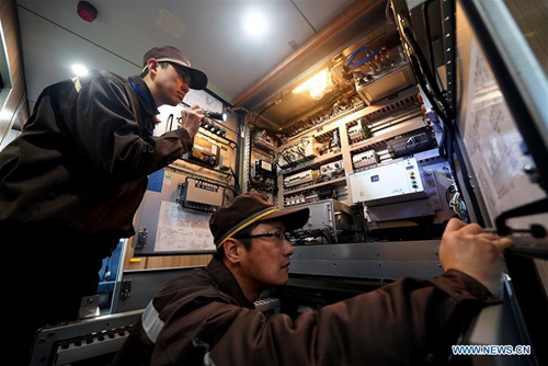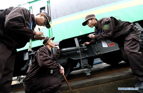 Workers check a CR200J train at the China Railway Shanghai Group Co., ltd. in Shanghai, east China, Jan. 6, 2019. The CR200J train, with a centralized power system that runs 160-km-per-hour, will be put into use before the Spring Festival travel rush in 2019.(Xinhua/Chen Fei)