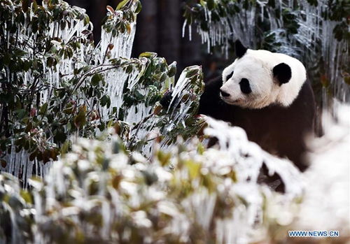 Giant panda "Ya Shuang" enjoys itself at the Wild World Jinan in Jinan, capital of east China's Shandong Province, Jan. 6, 2019. Giant pandas enjoy themselves here in winter. (Xinhua/Wang Kai)