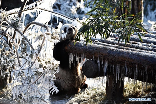Giant panda "Er Xi" climbs a tree at the Wild World Jinan in Jinan, capital of east China's Shandong Province, Jan. 6, 2019. Giant pandas enjoy themselves here in winter. (Xinhua/Wang Kai)