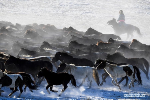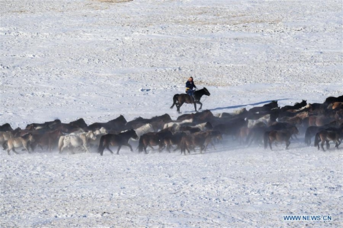 A herdsman tames horses in West Ujimqin Banner, north China's Inner Mongolia Autonomous Region, Jan. 8, 2019. (Xinhua/Liu Lei)