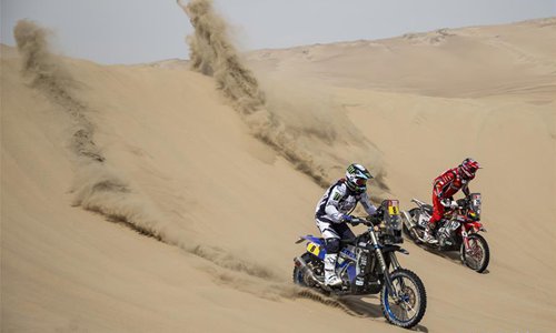 Argentine rider Franco Caimi (L) competes during the 2nd stage of the 2019 Dakar Rally Race in Peru, Jan. 8, 2019. Franco Caimi finished the 2nd stage with 3 hour 47 minutes and 40 seconds. (Xinhua/Li Ming)