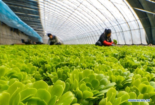 Farmers take care of succulent plants at a greenhouse in Guxin Township of Shexian County, Handan City, north China's Hebei Province, Jan. 9, 2019. Shexian has developed a succulent farming industry in recent years to help boost farmers' income. (Xinhua/Wang Xiao)