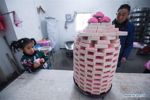 Villager Wu Gencai displays traditional rice cakes in Wupu Village of Wuxing District in Huzhou, east China's Zhejiang Province, Jan. 9, 2019. Local villagers cook traditional rice cakes to greet the upcoming Spring Festival. The Chinese Spring Festival represents the beginning of the Chinese Lunar Year and falls on Feb. 5 this year. (Xinhua/Xu Yu)