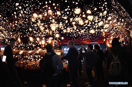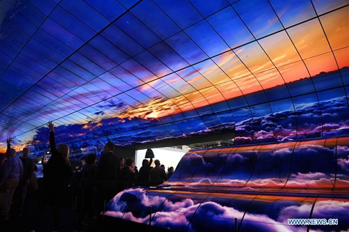Visitors watch a giant curved display of LG during the Consumer Electronics Show (CES) in Las Vegas, the United States, on Jan. 8, 2019. 2019 CES highlights new displays from global companies, such as LG, Samsung and Sharp. CES, the world's largest trade show to present new products and technologies in the consumer electronics industry, runs till Friday, attracting about 4,500 exhibitors and 180,000 attendees in 2019. (Xinhua/Liu Jie)