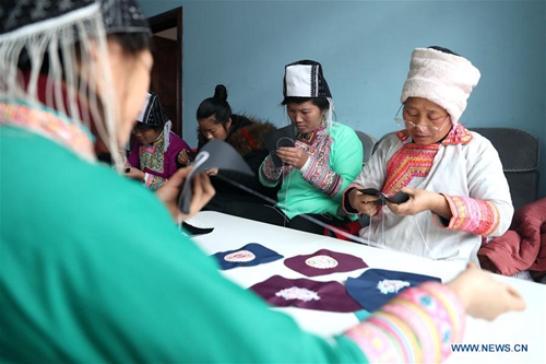Women of the Miao ethnic group make embroidery at the Shengyan encaustic painting and embroidery cooperative in Gaoniao Village, Rongjiang County of southwest China's Guizhou Province, Jan. 14, 2019. Making traditional handicrafts has increased the income of local women in Qiandongnan. (Xinhua/Yang Chengli)