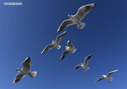 Photo taken on Jan. 4, 2019 shows red-billed gulls at Dianchi Lake in Kunming, capital of southwest China's Yunnan Province. (Xinhua/Yang Zongyou)