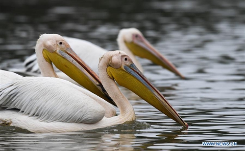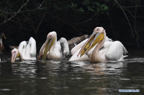 Pelicans are seen at a fishpond in Dingwen Village of Longquan County in Haikou, capital of south China's Hainan Province, Jan. 16, 2019. (Xinhua/Yang Guanyu)