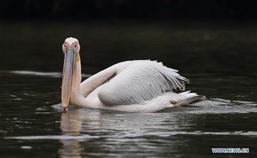 Photo taken on Jan. 16, 2019 shows a pelican at a fishpond in Dingwen Village of Longquan County in Haikou, capital of south China's Hainan Province. (Xinhua/Yang Guanyu)