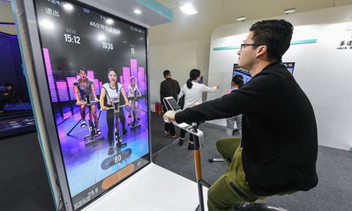 A staff demonstrates a smart sport platform based on 5G technology during a 5G technology exhibition in Hangzhou, east China's Zhejiang Province, Jan. 19, 2019. (Xinhua/Xu Yu)