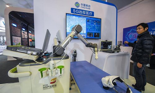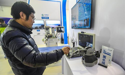 A man operates a remote medical emergency rescue system based on 5G technology during a 5G technology exhibition in Hangzhou, east China's Zhejiang Province, Jan. 19, 2019. (Xinhua/Xu Yu)