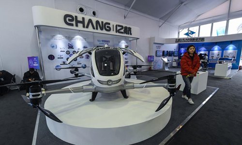 An automatic aircraft based on 5G technology is displayed in a 5G technology exhibition in Hangzhou, east China's Zhejiang Province, Jan. 19, 2019. (Xinhua/Xu Yu)