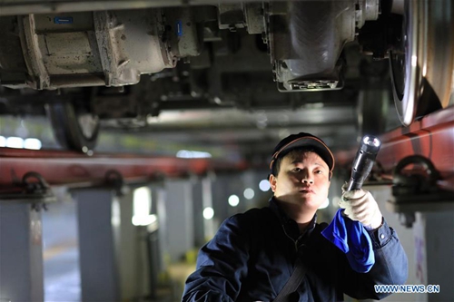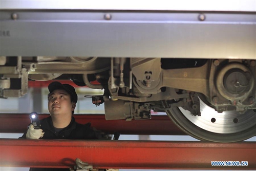 A mechanic checks a bullet train at a maintenance station to ensure safety for the upcoming Spring Festival travel rush in Guiyang, capital of southwest China's Guizhou Province, Jan. 19, 2019. (Xinhua/Ou Dongqu)