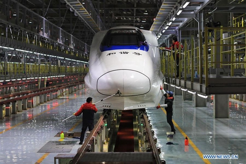 Workers clean a bullet train at a maintenance station to ensure safety for the upcoming Spring Festival travel rush in Guiyang, capital of southwest China's Guizhou Province, Jan. 19, 2019. (Xinhua/Ou Dongqu)