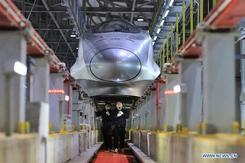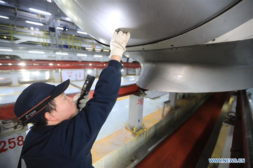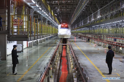 Mechanics check a bullet train at a maintenance station to ensure safety for the upcoming Spring Festival travel rush in Guiyang, capital of southwest China's Guizhou Province, Jan. 19, 2019. (Xinhua/Ou Dongqu)
