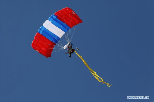A parachuting show is held during a celebration of the 70th anniversary of the founding of the Lao People's Armed Forces in Vientiane, Laos, Jan. 20, 2019. (Xinhua/Ju Zhenhua)