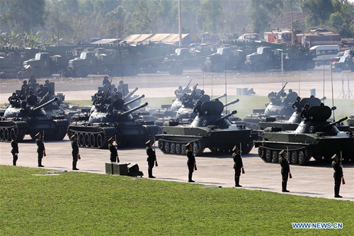 Tanks participate in a military parade during a celebration of the 70th anniversary of the founding of the Lao People's Armed Forces in Vientiane, Laos, Jan. 20, 2019. (Xinhua/Ju Zhenhua)