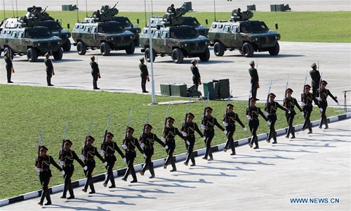 Soldiers participate in a military parade during a celebration of the 70th anniversary of the founding of the Lao People's Armed Forces in Vientiane, Laos, Jan. 20, 2019. (Xinhua/Ju Zhenhua)
