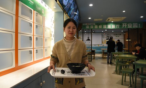 A diner holds her meal and walks past the food serving machine in an unstaffed restaurant in Nanjing, East China's Jiangsu Province. Photo: IC