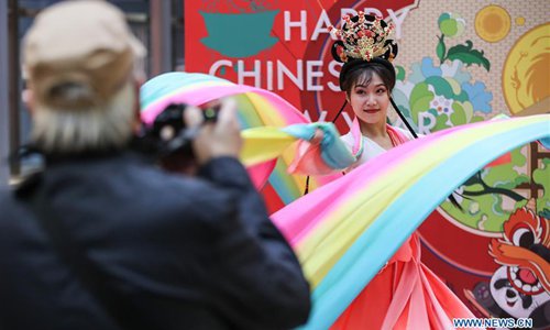 A visitor takes photos of a dancer in a shopping mall at Potsdamer Platz in Berlin, capital of Germany, on Jan. 24, 2019. "Happy Chinese New Year," a series of Chinese cultural celebrations for the upcoming Spring Festival, kicked off in downtown Berlin on Thursday. (Xinhua/Shan Yuqi)