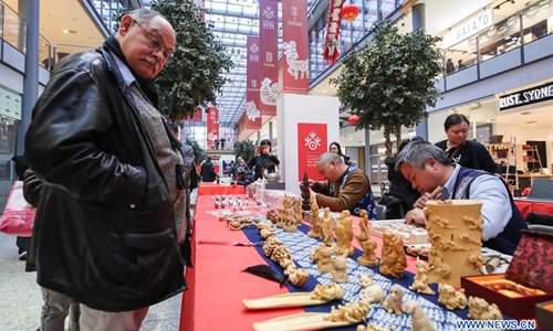 A visitor looks at traditional Chinese wood carvings in a shopping mall at Potsdamer Platz in Berlin, capital of Germany, on Jan. 24, 2019. "Happy Chinese New Year," a series of Chinese cultural celebrations for the upcoming Spring Festival, kicked off in downtown Berlin on Thursday. (Xinhua/Shan Yuqi)