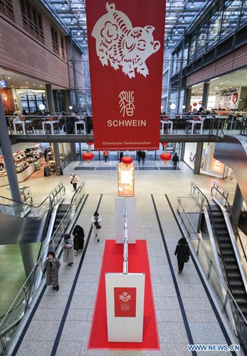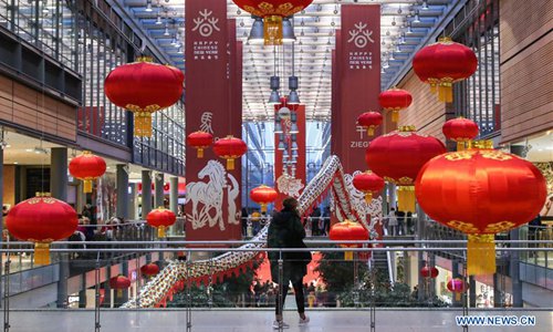 A woman walks past traditional Chinese decorations in a shopping mall at Potsdamer Platz in Berlin, capital of Germany, on Jan. 24, 2019. "Happy Chinese New Year," a series of Chinese cultural celebrations for the upcoming Spring Festival, kicked off in downtown Berlin on Thursday. (Xinhua/Shan Yuqi)