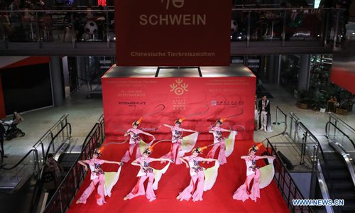 Dancers perform in a shopping mall at Potsdamer Platz in Berlin, capital of Germany, on Jan. 24, 2019. "Happy Chinese New Year," a series of Chinese cultural celebrations for the upcoming Spring Festival, kicked off in downtown Berlin on Thursday. (Xinhua/Shan Yuqi)
