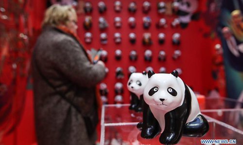 A visitor looks at exhibits in a shopping mall at Potsdamer Platz in Berlin, capital of Germany, on Jan. 24, 2019. "Happy Chinese New Year," a series of Chinese cultural celebrations for the upcoming Spring Festival, kicked off in downtown Berlin on Thursday. (Xinhua/Shan Yuqi)