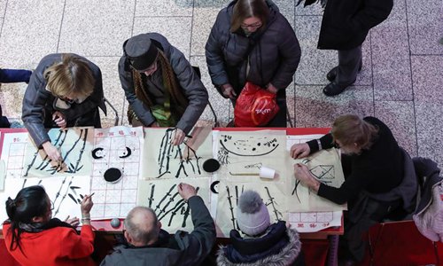 Visitors learn traditional Chinese painting in a shopping mall at Potsdamer Platz in Berlin, capital of Germany, on Jan. 24, 2019. "Happy Chinese New Year," a series of Chinese cultural celebrations for the upcoming Spring Festival, kicked off in downtown Berlin on Thursday. (Xinhua/Shan Yuqi)
