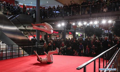 Acrobats perform in a shopping mall at Potsdamer Platz in Berlin, capital of Germany, on Jan. 24, 2019. "Happy Chinese New Year," a series of Chinese cultural celebrations for the upcoming Spring Festival, kicked off in downtown Berlin on Thursday. (Xinhua/Shan Yuqi)