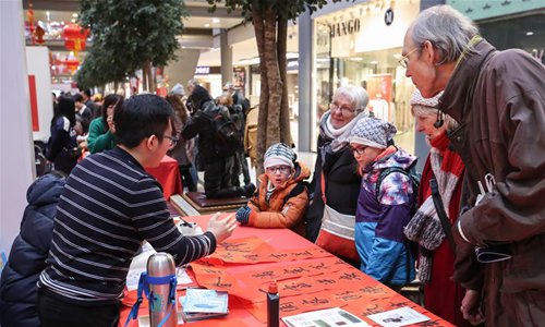 A staff member introduces Chinese Spring Festival couplets to visitors in a shopping mall at Potsdamer Platz in Berlin, capital of Germany, on Jan. 24, 2019. "Happy Chinese New Year," a series of Chinese cultural celebrations for the upcoming Spring Festival, kicked off in downtown Berlin on Thursday. (Xinhua/Shan Yuqi)