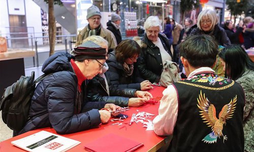 Visitors learn traditional Chinese paper cutting in a shopping mall at Potsdamer Platz in Berlin, capital of Germany, on Jan. 24, 2019. "Happy Chinese New Year," a series of Chinese cultural celebrations for the upcoming Spring Festival, kicked off in downtown Berlin on Thursday. (Xinhua/Shan Yuqi)