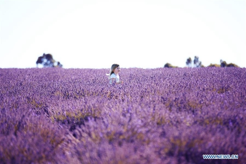 A girl runs in lavender blossoms at Bridestowe Lavender Estate in Tasmania state, Australia, Jan. 21, 2019. (Xinhua/Pan Xiangyue)