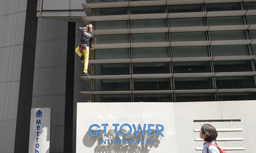 A pedestrian looks at French urban free-climber Alain Robert, popularly known as the "French Spiderman," on the side of the 47-story GT Tower during his climb in Manila's financial district of Makati on Tuesday. The 56-year old adventurer climbed the tower without safety equipment. Photo: AFP