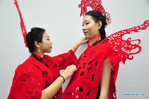 Craftswoman Liang Ying (L) helps a cheongsam enthusiast put on her papercutting work of cheongsam at her studio in Liaocheng, east China's Shandong Province, Jan. 30, 2019. Liang Ying made 18 papercutting works of cheongsam to greet the upcoming Spring Festival, which falls on Feb. 5 this year. (Xinhua/Xu Wenhao)