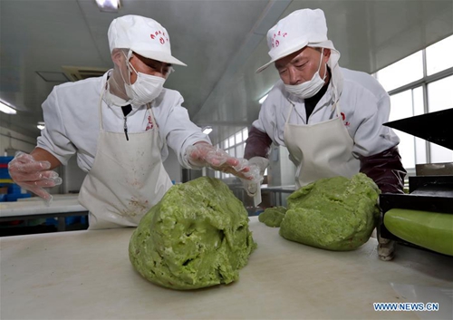 Workers make rice cakes of a traditional brand in Wuxi, east China's Jiangsu Province, Jan. 30, 2019. Workers in Wuxi are busy making rice cakes to meet customers' growing demands as the Spring Festival approaches. The Spring Festival, or the Chinese Lunar New Year, falls on Feb. 5 this year. (Xinhua/Huan Wei)