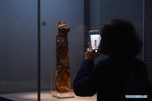 A visitor takes pictures of a cat mummy displayed in an exhibition of ancient Egyptian civilization at Zhejiang West Lake Gallery in Hangzhou, capital of east China's Zhejiang Province, Jan. 30, 2019. A total of 180 cultural relics from Italian museums are displayed in an exhibition of ancient Egyptian civilization from Jan. 22 to May 5, 2019. (Xinhua/Huang Zongzhi)