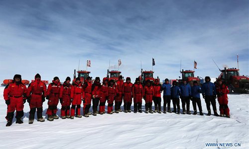 Members of the 35th Chinese research mission to the Antarctic, from the Kunlun and Taishan teams, pose for a group photo in Antarctica on Feb. 4, 2019. (Xinhua/Liu Shiping)