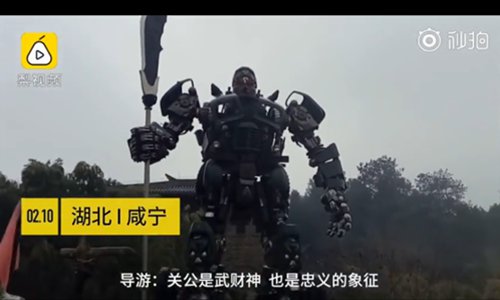 The statue of Guan Yu in a mockup of an ancient village in Xianning, Hubei Province appears to be straight out of central casting for a Transformer movie. Source: Pear Video