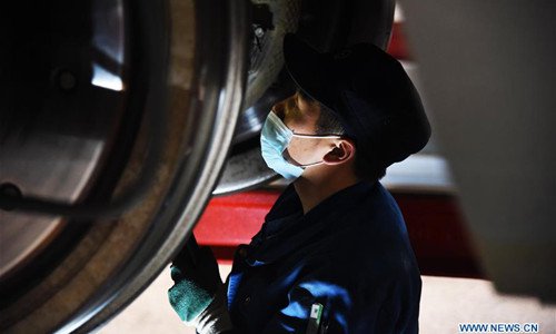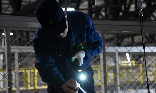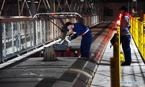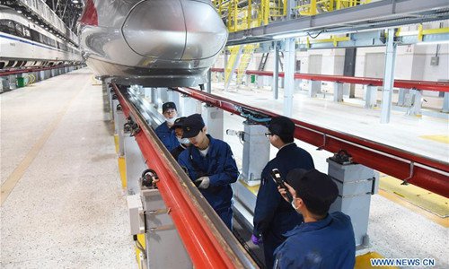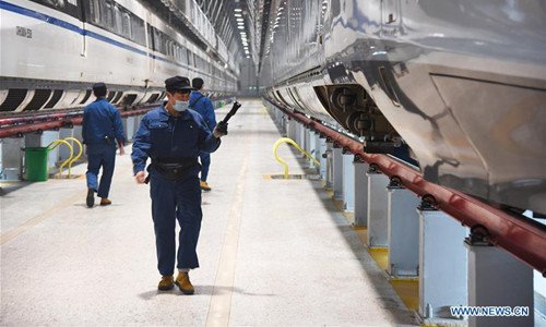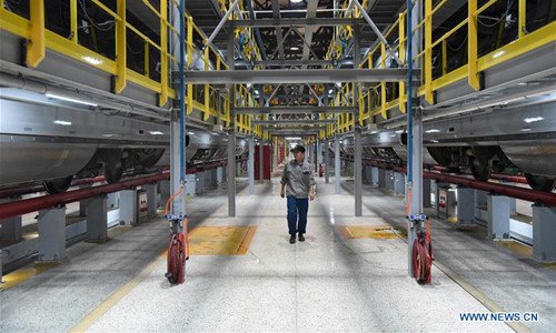 A mechanic checks a Fuxing bullet train at a maintenance station in Jinan, east China's Shandong Province, Feb. 12, 2019. Fuxing bullet trains are usually in service in the daytime and in maintenance at night. With a maximum speed of 350 kilometers per hour, Fuxing represents the best of China's high-speed railway technology. (Xinhua/Wang Kai)