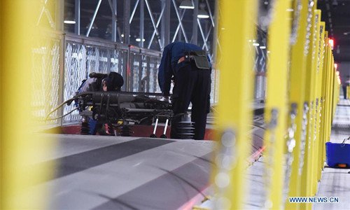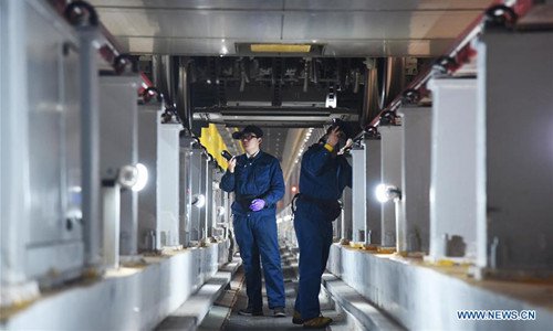 Mechanics check a Fuxing bullet train at a maintenance station in Jinan, east China's Shandong Province, Feb. 12, 2019. Fuxing bullet trains are usually in service in the daytime and in maintenance at night. With a maximum speed of 350 kilometers per hour, Fuxing represents the best of China's high-speed railway technology. (Xinhua/Wang Kai)