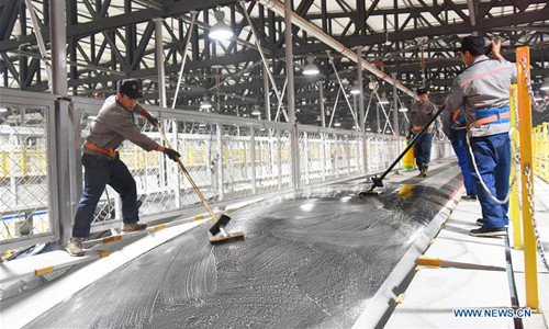 Workers clean a Fuxing bullet train at a maintenance station in Jinan, east China's Shandong Province, Feb. 12, 2019. Fuxing bullet trains are usually in service in the daytime and in maintenance at night. With a maximum speed of 350 kilometers per hour, Fuxing represents the best of China's high-speed railway technology. (Xinhua/Wang Kai)