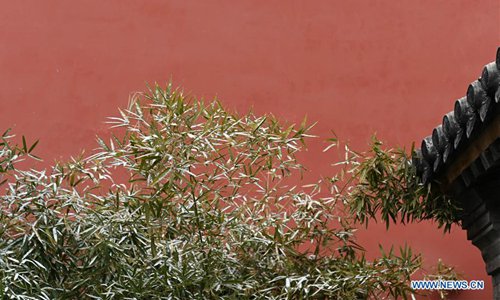 The photo shows the snow-covered bamboo at the Palace Museum in Beijing, capital of China, Feb. 14, 2019. All tickets to the museum, which allows 80,000 visitors per day, were sold out on Thursday. (Xinhua/Jin Liangkuai)