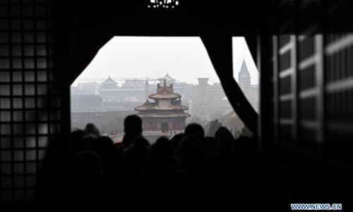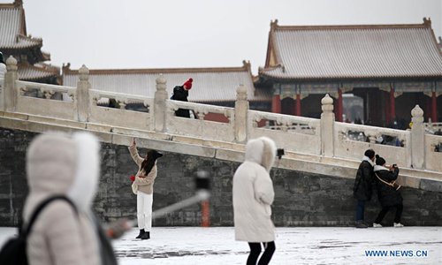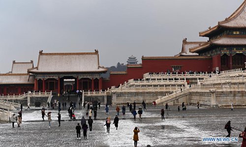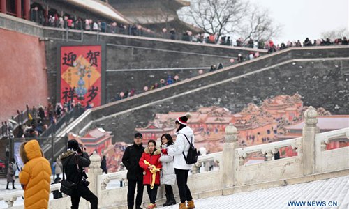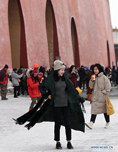Visitors view the snowy scenery at the Palace Museum in Beijing, capital of China, Feb. 14, 2019. All tickets to the museum, which allows 80,000 visitors per day, were sold out on Thursday. (Xinhua/Jin Liangkuai)