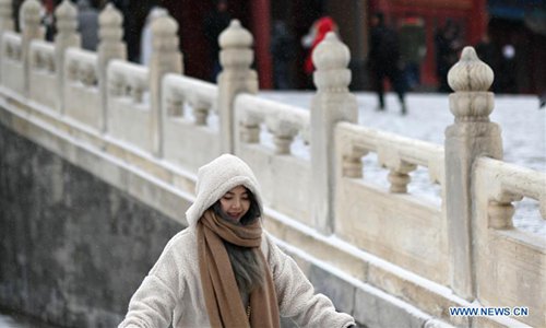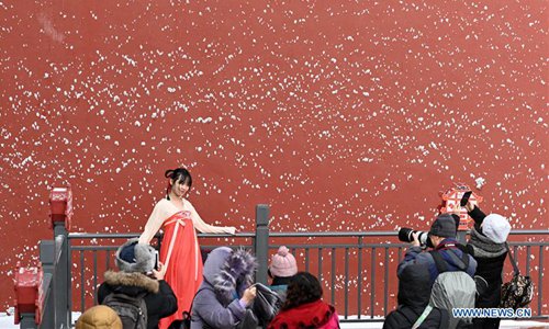 A woman wearing traditional costume poses for photos in snow at the Palace Museum in Beijing, capital of China, Feb. 14, 2019. All tickets to the museum, which allows 80,000 visitors per day, were sold out on Thursday. (Xinhua/Jin Liangkuai)
