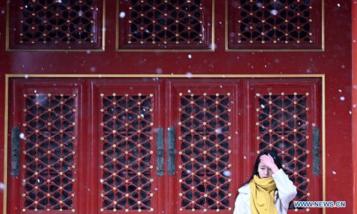 A visitor views the snowy scenery at the Palace Museum in Beijing, capital of China, Feb. 14, 2019. All tickets to the museum, which allows 80,000 visitors per day, were sold out on Thursday. (Xinhua/Jin Liangkuai)